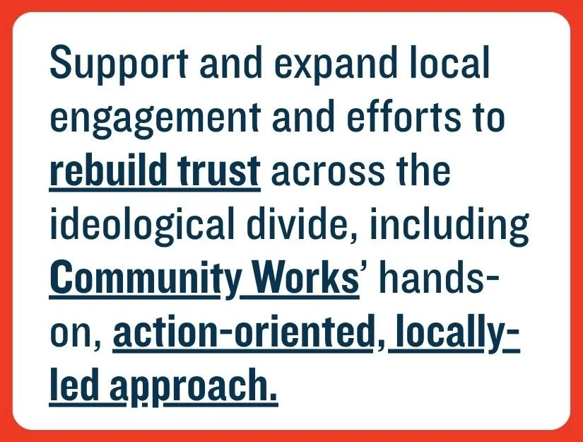 Community Works is RUBI’s on the ground effort to restore trust, address concrete local needs, and increase collaboration across political differences in rural communities.